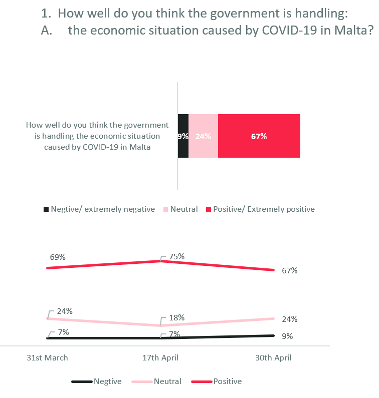 •With 67% responses the general public is of the opinion that the government is handling the economic situation caused by COVID-19 in Malta well, with 36% expressing positive views while 31% felt extremely positive. While positive, locals’ positive perception decreased by 8% when compared with the study conducted 2 weeks and is the lowest score over the 1 month period.