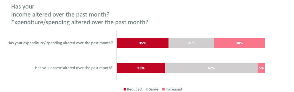 •62% of respondents indicated that their income had remained stable over the past month. Conversely, 33% indicated that their income had decreased. (Of these, 19% indicated that it had slightly decreased while 14% indicated that it had reduced considerably).