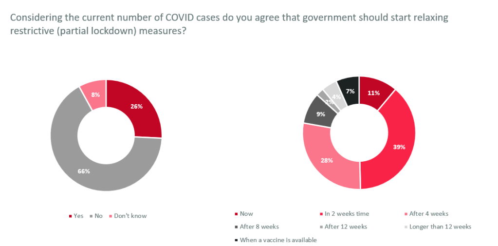 •Among those that believe that government should start relaxing restrictive measures, the majority (78% or 105 responses) believe government should do so over the coming four weeks.
