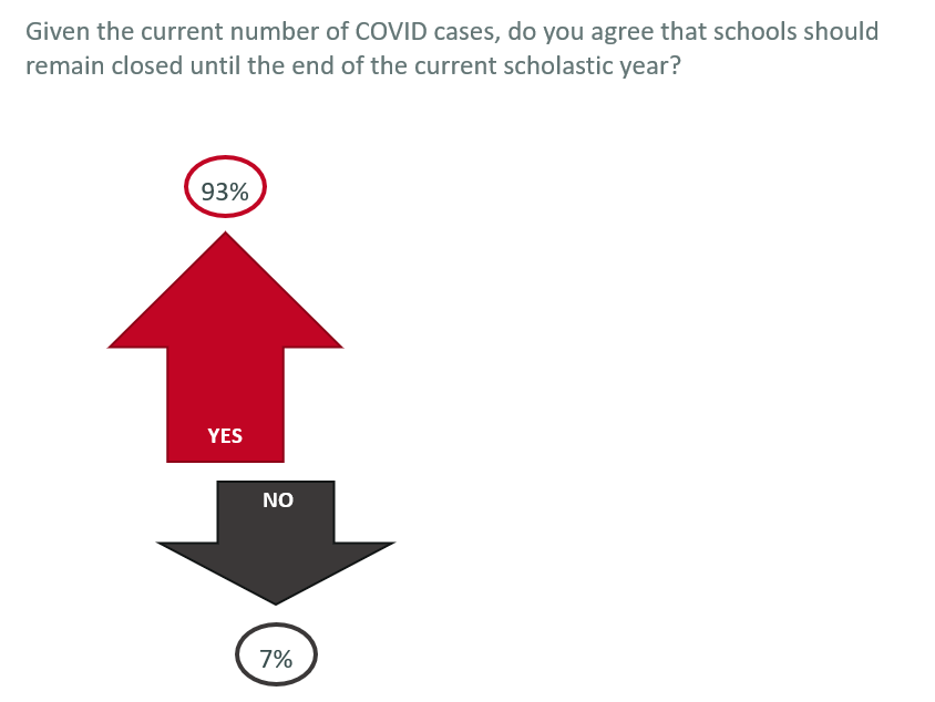 •By and large, the population agrees that schools should remain closed until the end of the current scholastic year.