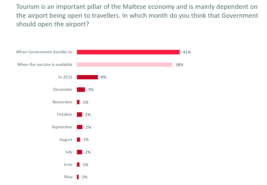 •The general public does not think that the Government should open up the airport any time soon, with only 13% indicating that this should be done some time this year. 41% trust in the Government to decide when its best. 38% are of the opinion that the airport should only open up once a vaccine is available. Furthermore, the majority (76%) are not ready to make a trade off in their decision, should this imply an increase in unemployment. Even among those that answered in the positive (24%), those that believe the airport should re-open any time soon are minimal.