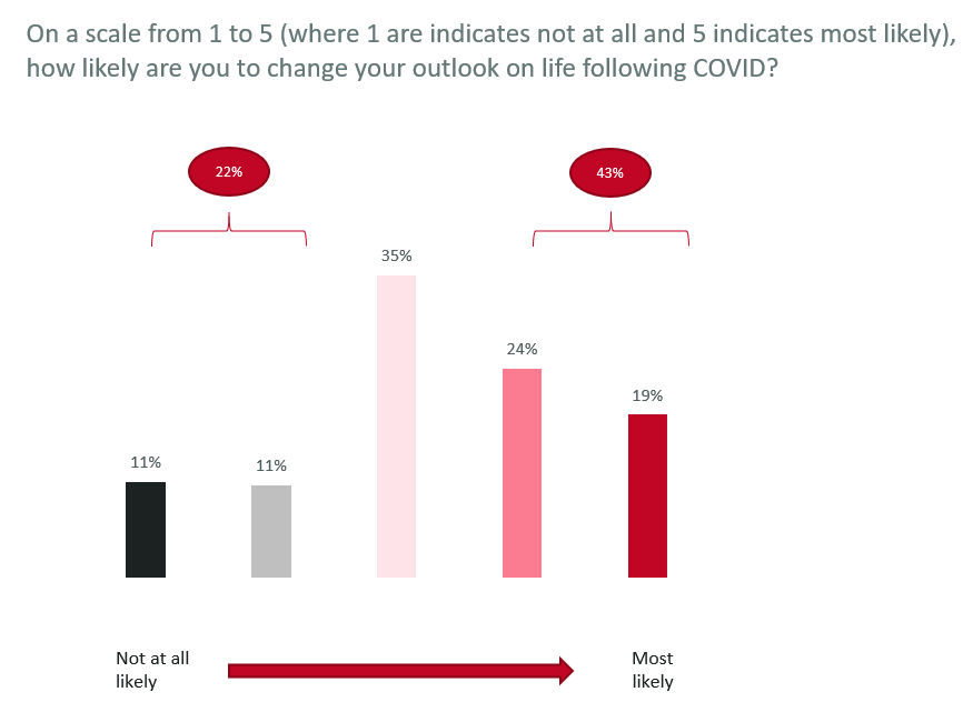 •43% of respondents are likely to change their outlook on life following COVID (of these 24% indicated that it was likely while 19% indicated that it was most likely). Conversely, 22% indicated that it was unlikely that their outlook on life to change.