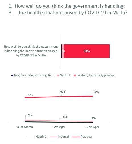 •With 94% responses, the general public is of the opinion that the government is handling the health situation caused by COVID-19 in Malta well with 21% expressing positive views and 73% felt extremely positive.