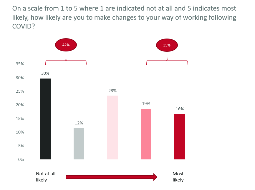 •42% of those in employment do not think that they are likely to make changes to their way of working following COVID. Conversely, 35% indicated that it was likely/ most likely that they would make changes.