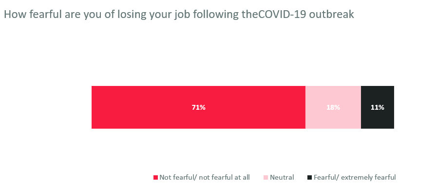 •With 71% responses, overall individuals who are currently in employment do not fear losing their job (11% are fearful/ extremely fearful). There are variances in responses between those working in the private sector as opposed to those in the public sector. 83% of those in the public sector are not fearful/ not fearful at all as opposed to 63% of those in the private sector. 15% of the private sector are fearful as opposed to 5% of the public sector (with the rest expressing neutral views).
