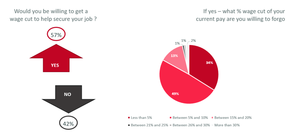 •57% of those in employment would be willing to get a wage cut to help secure their job with the majority (83%) willing to forgo under 10%. Over the three studies, those willing to get a wage cut ranged between 55% and 64%, with those willing to forgo 10% of their wages or less ranging between 71% and 83%.