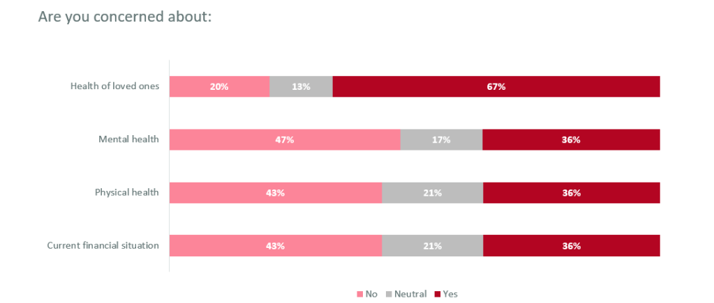 •Among the various factors under review, locals’ main concern relates to the health of their loved ones, though this figure has decreased slightly from the previous study (then 75% answered in the positive, now 67%). Overall, locals concerns have decreased since the previous study. Then 50% were concerned about their physical health (now 36%) and 43% were concerned about their mental health (now 36%). Concerns about their financial situation remained stable (then 35%, now 36%).