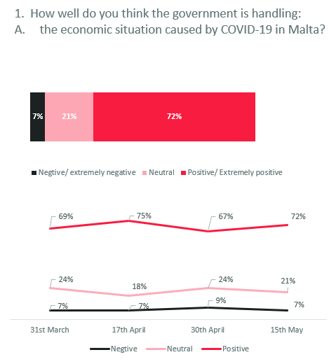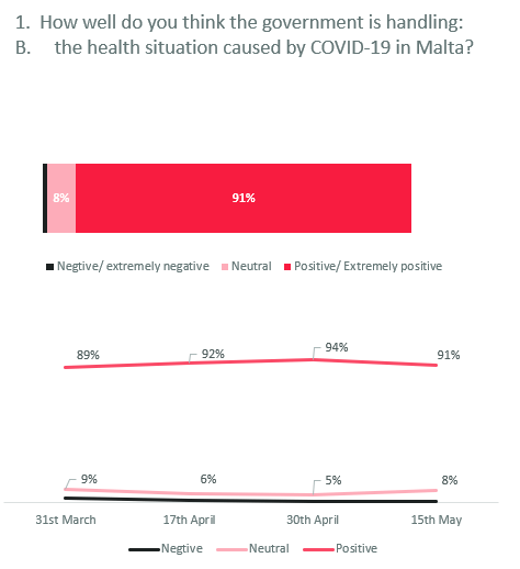 In line with past surveys, the Maltese are overall satisfied with the way the government is handling the COVID-19 situation, both in terms of the health situation and the economic one. 72% of the general public is of the opinion that the government is handling the economic situation caused by COVID-19 in Malta well. Locals’ positive perception increased marginally (by 5%) when compared with the study conducted 2 weeks ago, though overall locals still have stronger positive views to how Government is handling the health situation (91% positive views as opposed to 94% 2 weeks ago).