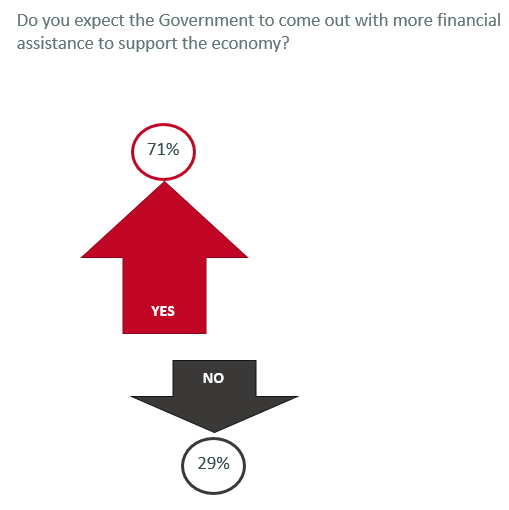 71% expect the Government to come out with more financial assistance to support the economy (78% in the previous study).