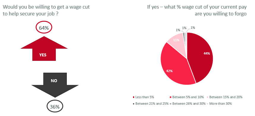 •Those willing to get a wage cut increased marginally (previously 57%). Within this segment 86% would be willing to forgo 10% of their wages or less.