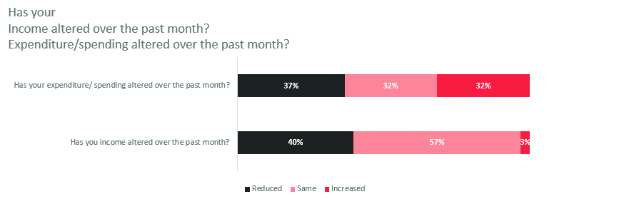 •In terms of expenditure, 32% indicated that their expenditure had not altered over the past month. 37% indicated that their expenditure had decreased while 32% indicated that it had increased. Such figures are consistent with the study conducted 2 weeks ago.
