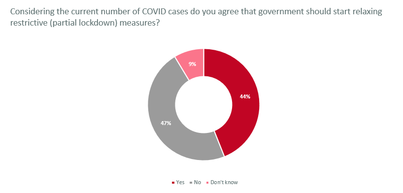 44% of respondents agree that the government should start relaxing restrictive (partial lockdown) measures. This represents a considerable increase over the previous study. 2 weeks ago 26% were in agreement. 47% do not agree (2 weeks ago the percentage of those that disagreed stood at 66%).