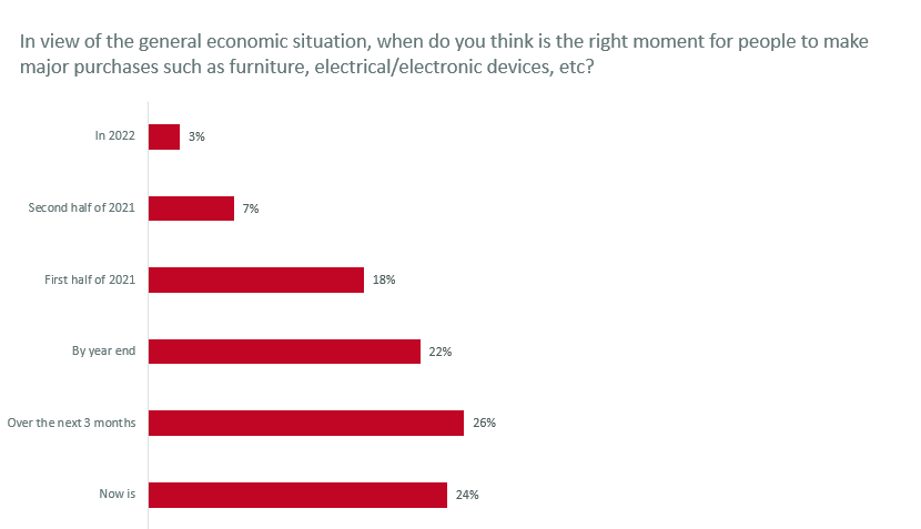 Mixed views were noted when analysing consumers’ opinions with respect to major purchases such as furniture, electrical/electronic devices. 24% of the population think that now is the right moment for people to make major purchases such as furniture, electrical/electronic devices and similar, with another 26% indicating ‘over the next 3 months’ and 22% by year end. Conversely, 28% had conservative views with 25% indicating that it would be opportune to wait until 2021, with 3% indicating to wait till 2022.