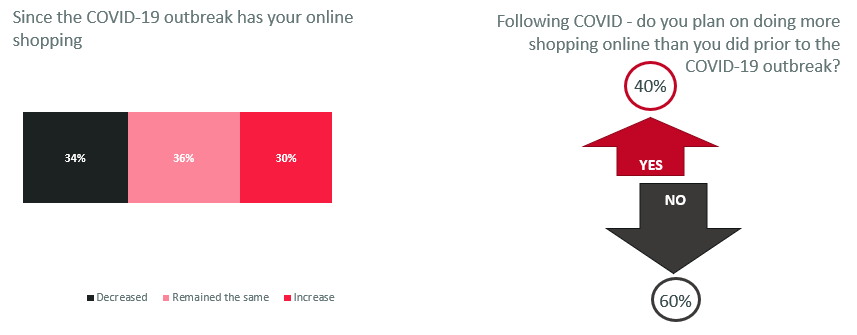 •While 30% indicated that their online shopping had increased, 34% indicated a decrease.