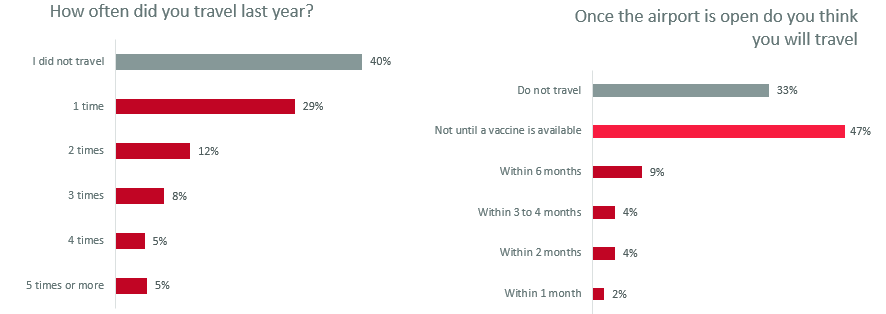 Travelling is likely to be considerably impacted by COVID-19. A review of travel habits evidences that last year 60% of respondents had travelled at least once. Nonetheless, 19% indicated their likelihood of travelling within 6 months or more often once the airport is open. Conversely, 47% will wait until a vaccine is available prior to travelling.