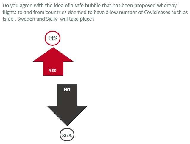 Furthermore, the vast majority of respondents (86%) do not agree with the idea of a safe bubble that has been proposed whereby flights to and from countries deemed to have a low number of Covid cases such as Israel, Sweden and Sicily will take place.