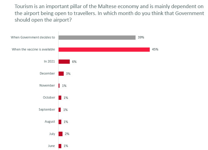 The general public does not think that the Government should open up the airport any time soon, with only 10% indicating that this should be done some time this year. Furthermore, the majority of the population (77%) are not ready to change their opinion, even if such a decision would result in an increase in unemployment (of between 15% and 20%). Such figures are consistent with results collated 2 weeks ago.