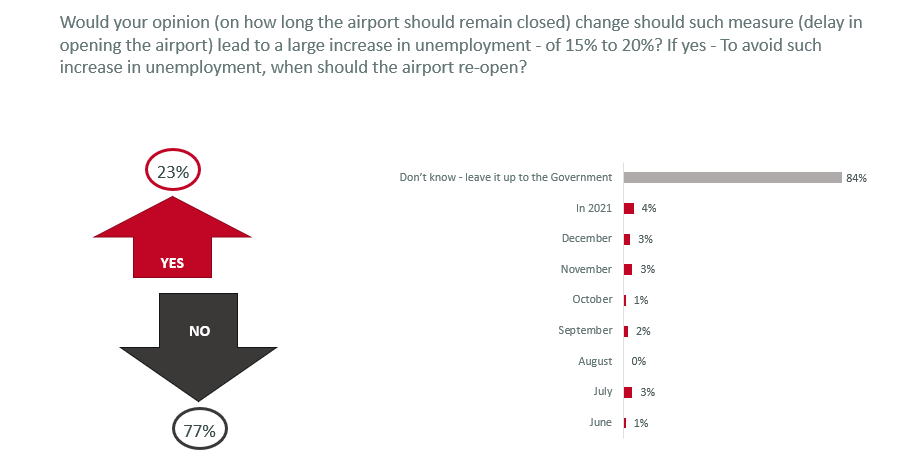 •Even among those that answered in the positive (23%), those that believe the airport should re-open any time soon are minimal (13%).