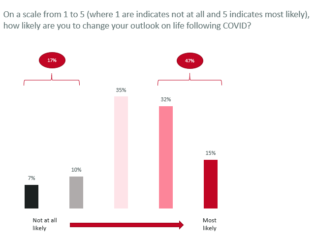 47% of respondents are likely to change their outlook on life following COVID (of these 32% indicated that it was likely while 15% indicated that it was most likely). Although marginally higher, this figure is consistent with the previous study (then 43%)