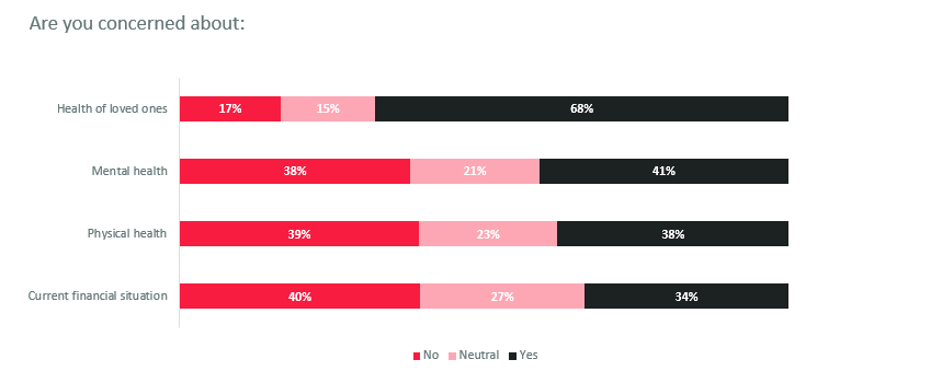 •41% are concerned about their mental health, with 34% concerned about their financial situation.