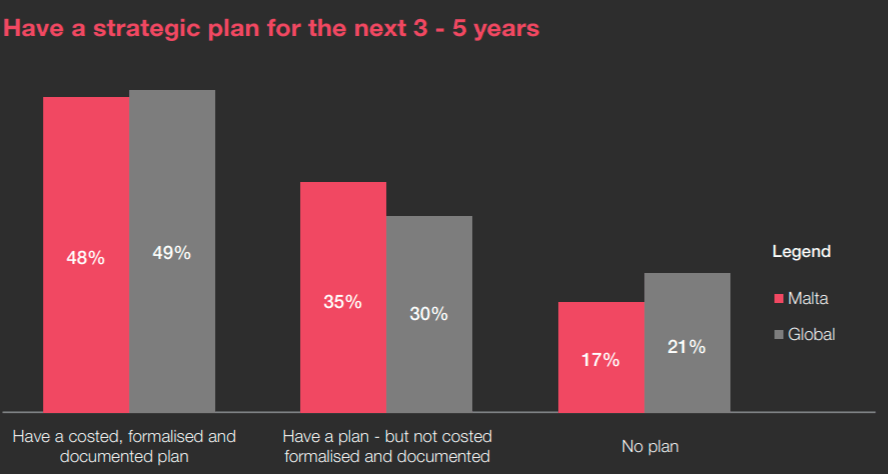 Many family business people resist family business planning and even fail to develop a systematic framework for thinking about the future strategy of their families and businesses. This is also so in Malta. As can be seen below, the PwC Family business survey in Malta found that some 52% of family businesses in Malta have no formal strategic plan for their business.