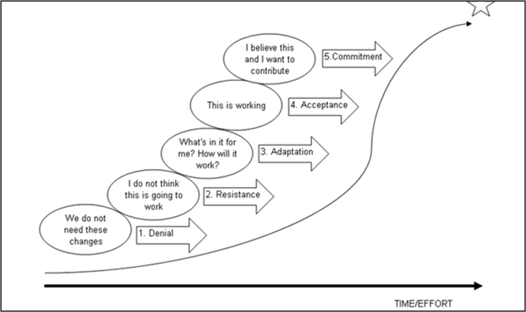 Notwithstanding the best of efforts at creating a strong case for change, there will always be those who will resist change. This is quite normal. There is however only one sensible approach – communicating, communicating and communicating to overcome negative perceptions and emotional & psychological fears of change, until the majority of people go through the change process shown below: