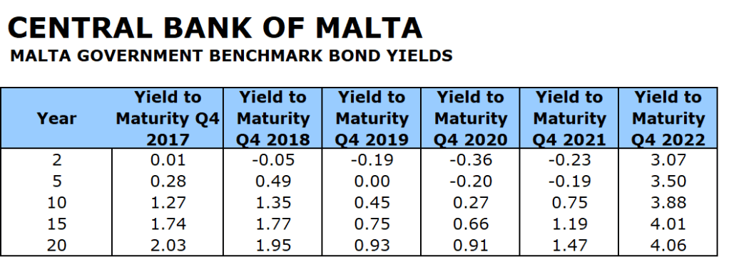For most of the last 15 years, capital has been cheap. Since the 2008/9 final crisis the cost of borrowing has been very low. All that changed last year, when the world’s central banks began raising interest rates to curb rising inflation. As seen below, whilst in previous years, a 10 year Malta government bond had a yield which was very low, sometimes even close to a 0% YTM (yield-to-maturity), by the end of 2022 a 10 year Malta Government bond was yielding a YTM of around 4%. With the sovereign Malta government bonds being considered almost risk free, corporate bonds need to be issued at higher rates, to cover the risk premium.