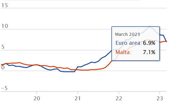 However, with Malta’s government absorbing all the impact of high energy prices, the impact of energy inflation was not felt in Malta. Hence as one of the largest contributors to European inflation declined, we ended up with an average HICP euro area inflation rate which is now lower than Malta’s HICP inflation rate.