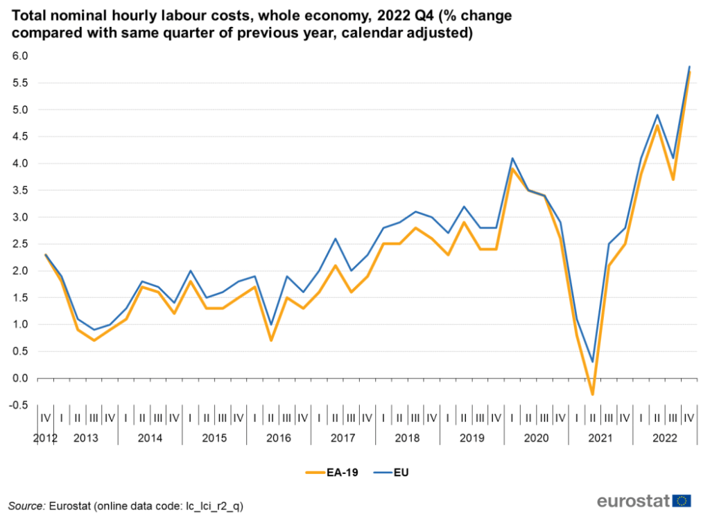 Labour costs in Europe, by end Q4 2022, have sky rocketed due to the tight labour market as shown below, through the labour cost index published by Eurostat.