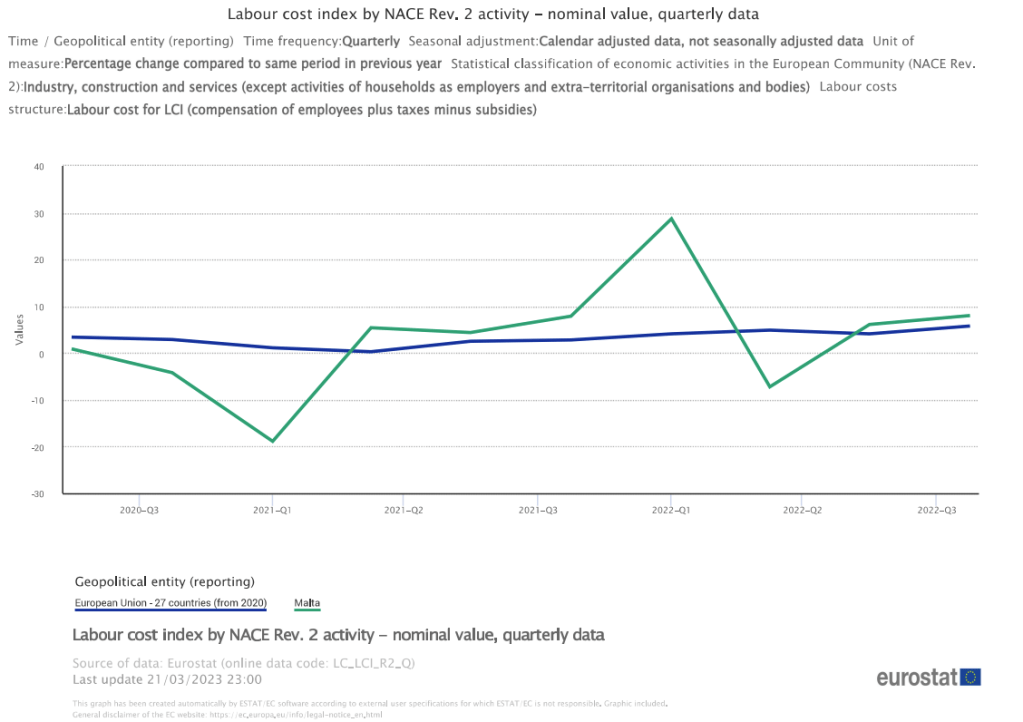 However further below one also sees a comparison of the same labour cost index between the EU average and that of Malta. It is evident that for most of 2022 and into 2023, Malta’s labour cost index has jumped over the EU average.