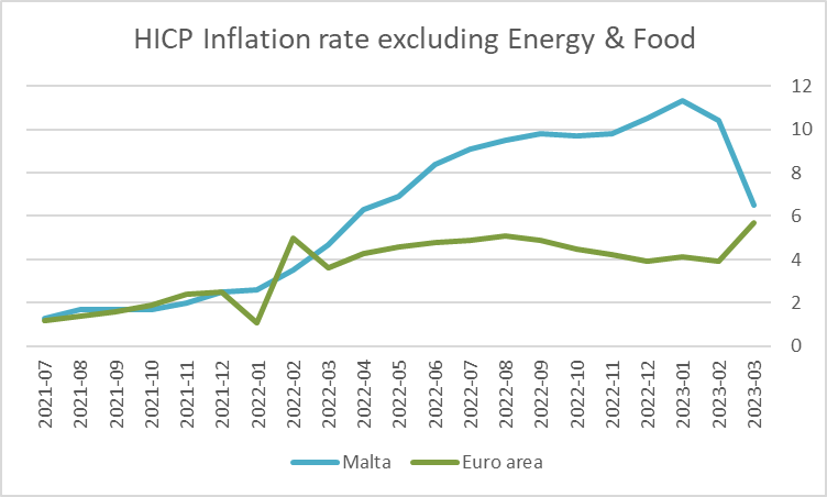 Infact, if one where to have a look at the HICP Inflation rate excluding Energy & Food for Malta and the Euro area, Malta’s inflation rate excluding Energy & Food has been persistently higher than the Euro area average for the past year or so.