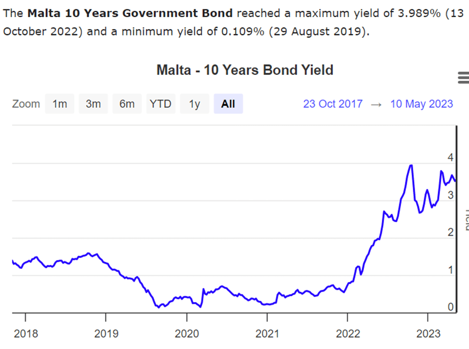 The bond markets have already reacted to this. As can seen below the yields on both a 10-year Malta Government Bond and a German Sovereign Bond have increased drastically, standing today at around 3.5% and 2.3%. This means that Corporate Bond Issuers will need to offer much higher coupon rates, to adequately reward investors for the risk premium beyond the above mentioned risk free rates.