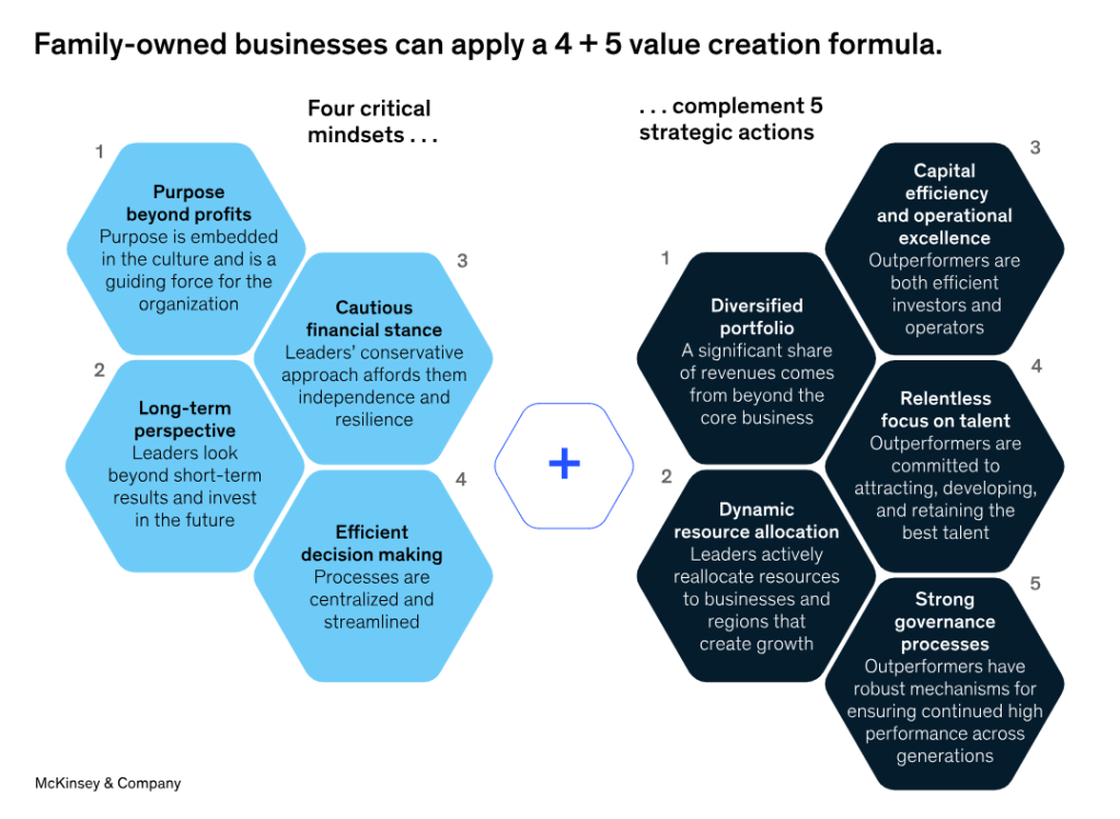 A recent research article my McKinsey outlined a number of critical mindsets and strategic actions that are the fundamentals which allow family businesses not only to succeed but to also outperform other non-family businesses. The article is some 15 pages long and knowing how everyone is time pressed I am providing a summary below.