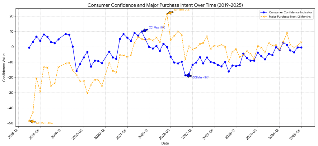- Pre-Pandemic Pessimism (Early 2019): Interestingly, the MP12M indicator started at a very low point (-48.6 in March 2019), suggesting significant hesitation towards major purchases even before the pandemic. It then showed some recovery into 2020.
