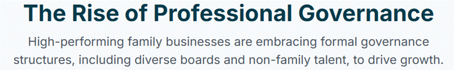 The increasing adoption of formal governance structures, diverse boards, and the integration of professional non-family talent in family businesses signifies a strategic shift towards best practices. This shift is driven by a desire for enhanced performance, reduced internal conflicts and the capacity to scale effectively. This suggests that professionalisation serves as a catalyst for resilience and growth, enabling family businesses to navigate increasing complexity and ensure long-term continuity, especially in the context of significant intergenerational wealth transfers.