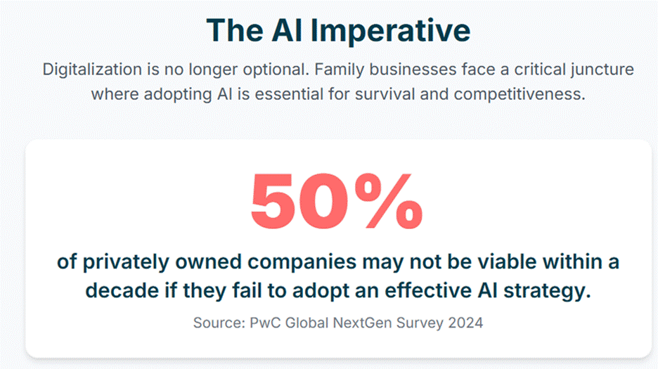The integration of digital technologies, particularly artificial intelligence, has emerged as a paramount strategic concern for family businesses in all research articles issued in 2024 and 2025. Family Business Magazine identifies AI as the “top strategic priority for family-owned businesses in 2025,”. This shift reflects a broader understanding that AI is no longer a luxury but a fundamental requirement for maintaining competitiveness. The urgency is further underscored by PwC’s Global NextGen Survey 2024, which indicates that 70% of business leaders believe generative AI will profoundly alter how their businesses create, deliver, and capture value. Alarmingly, the survey also suggests that half of privately owned companies, including family businesses, may not remain viable within a decade if they fail to adopt an effective AI strategy.